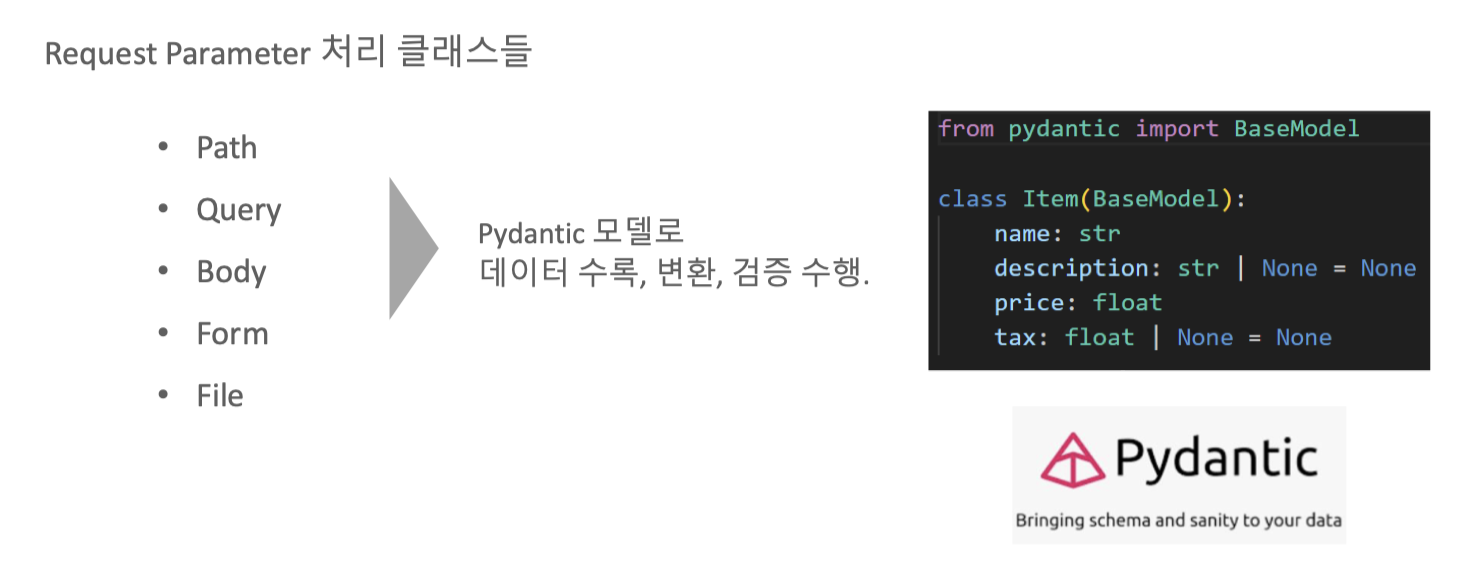 FastAPI는 Path Parameter, Query Parameter, Request Body, Form Fields, Header, Cookie, File 등의 다양한 Request 들을 다룰 수 있게 지원함.