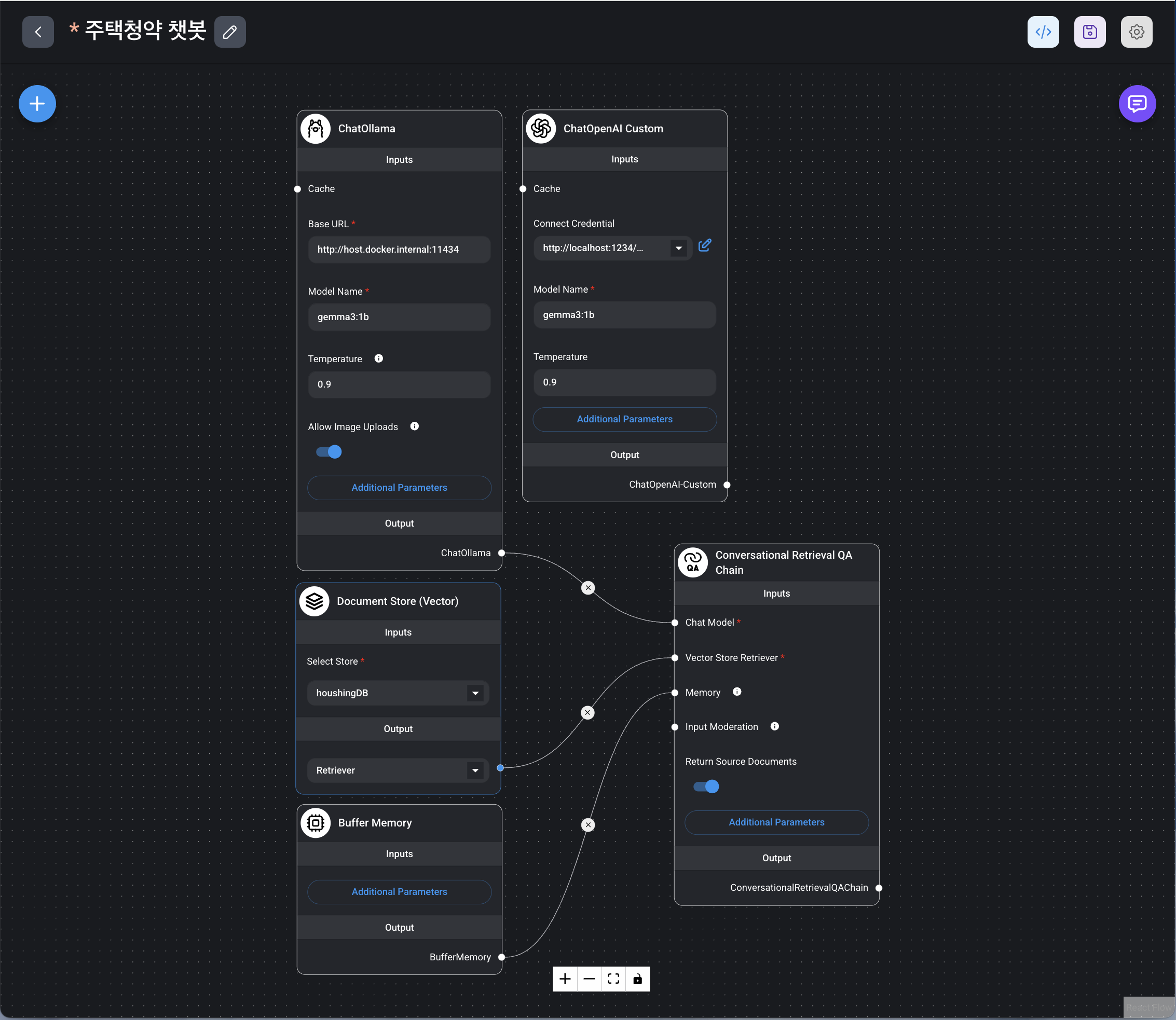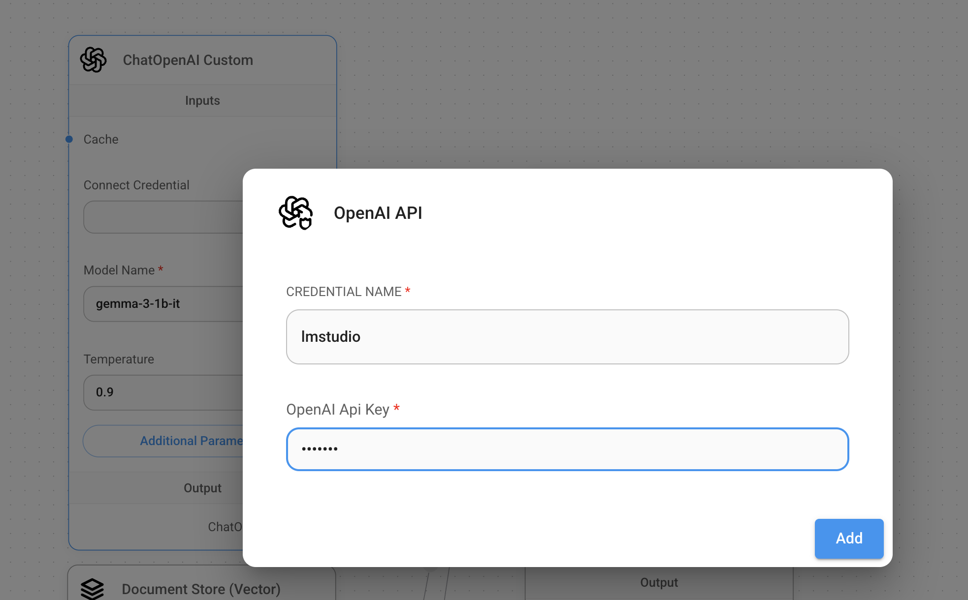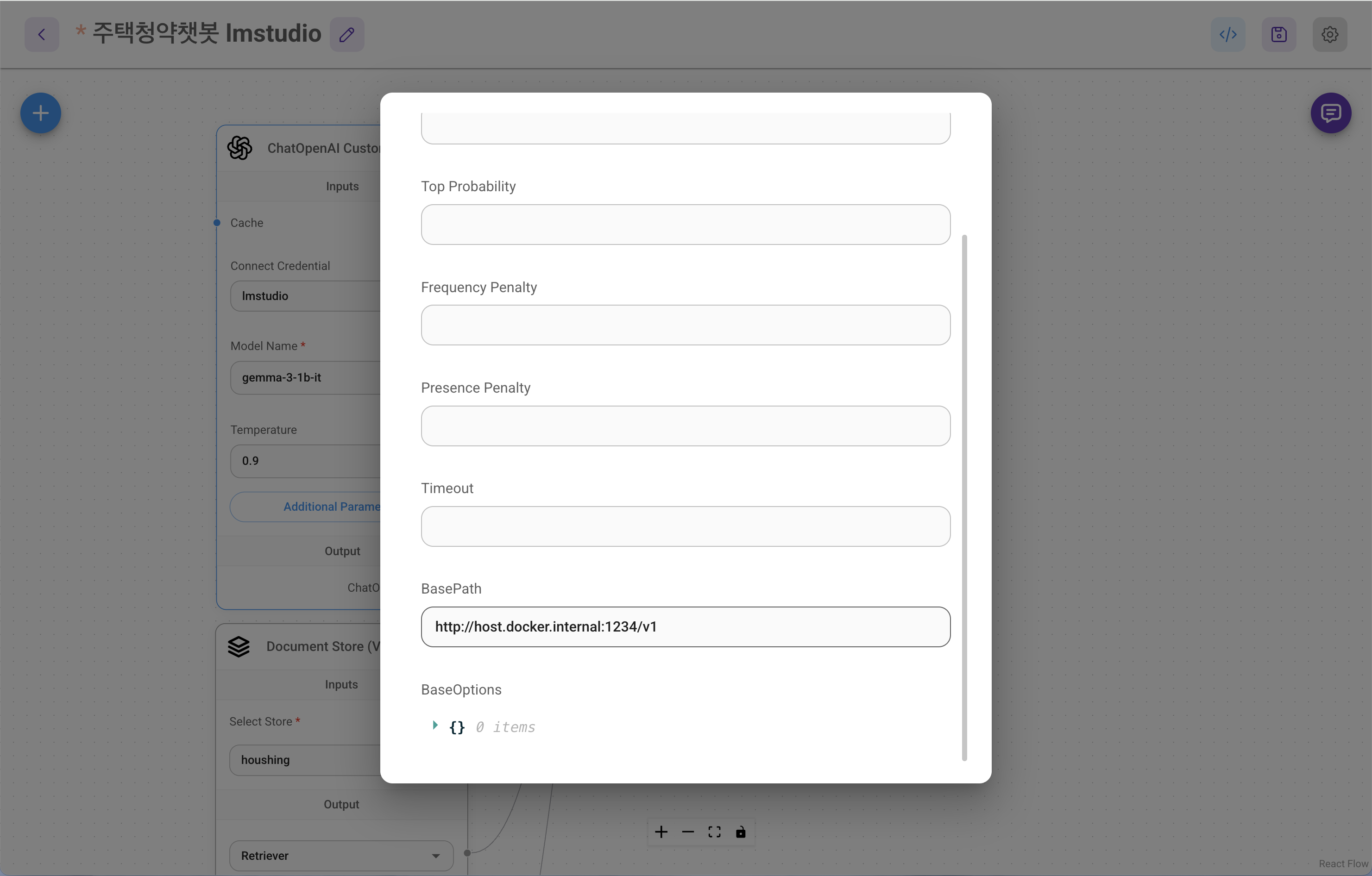 flowise Chatflows에서 ChatOpenAI Custom 노드 추가하고,